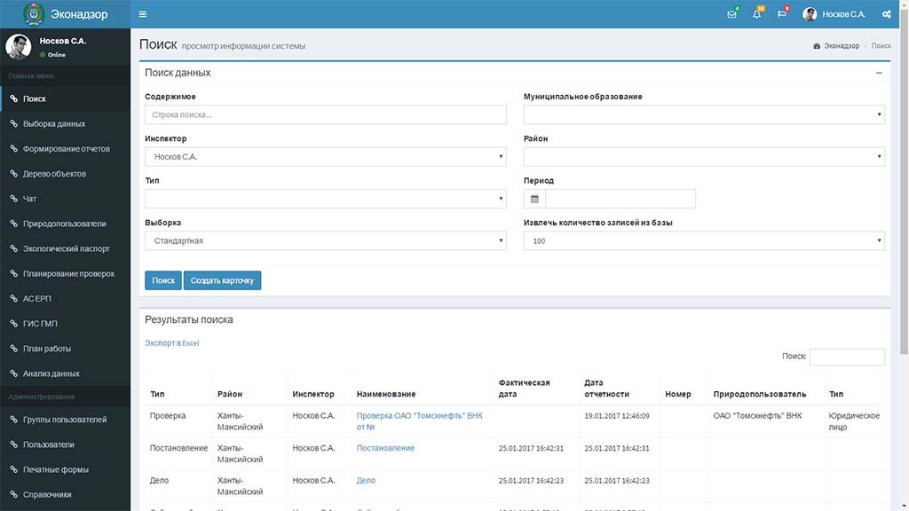 Информационная система разработана для службы по контролю и надзору в сфере охраны окружающей среды (Росприроднадзор) и успешна внедрена в Природнадзоре Югры.